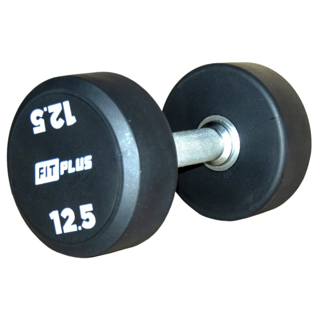 Pevná jednoruční polyuretanová činka FIT PLUS, vhodná pro domácí trénink nebo jakékoli fitness centrum. V bílém kruhu činky se vyjímá logo FIT PLUS.