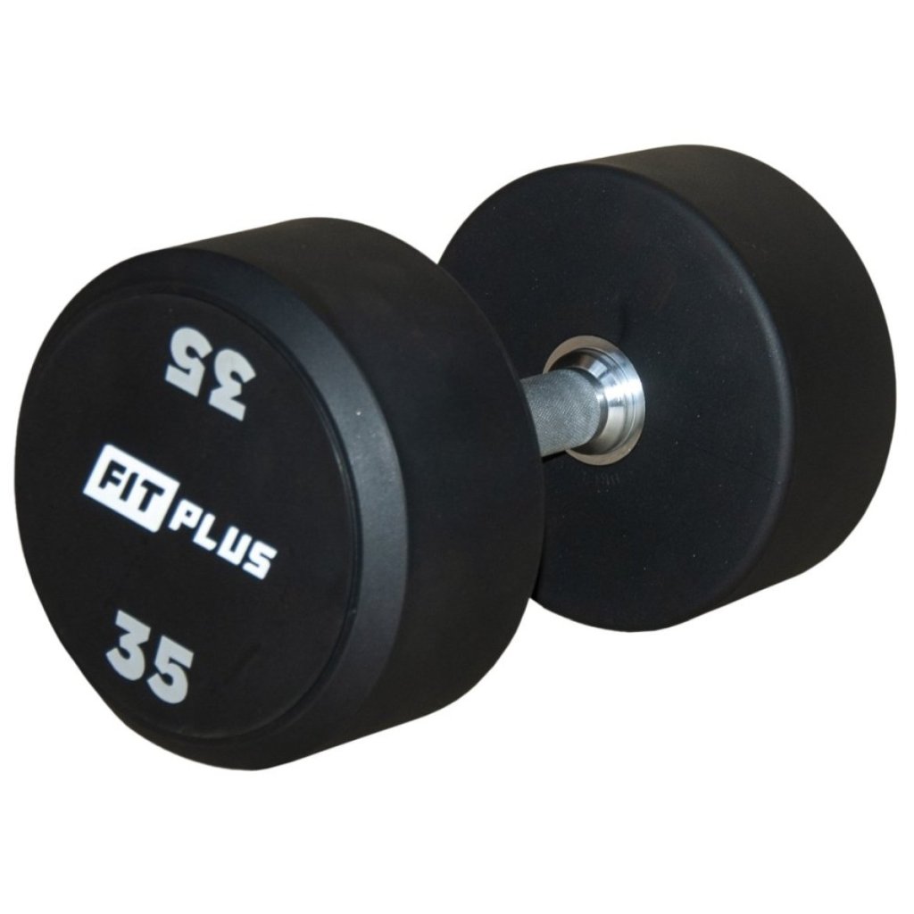 Pevná jednoruční polyuretanová činka FIT PLUS, vhodná pro domácí trénink nebo jakékoli fitness centrum. V bílém kruhu činky se vyjímá logo FIT PLUS.