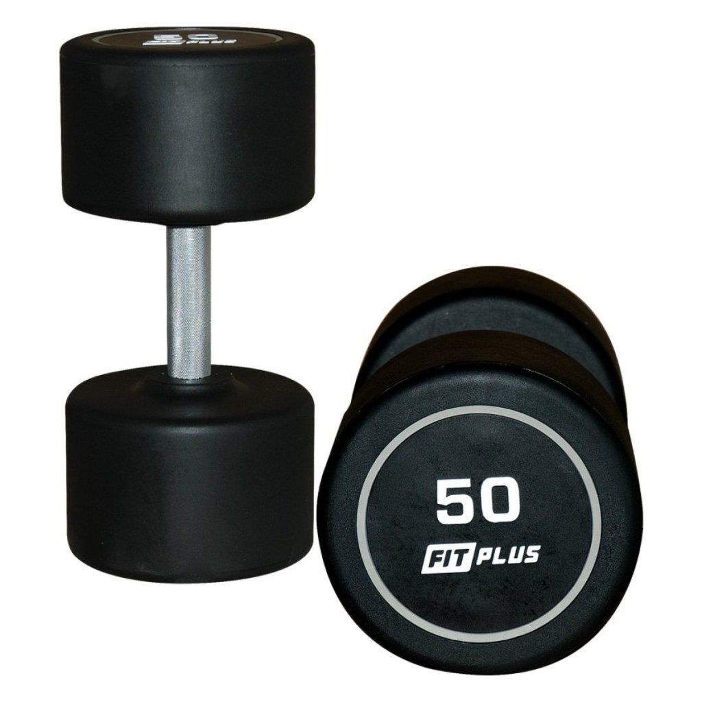 Pevné jednoruční polyuretanové činky FIT PLUS, vhodné pro domácí trénink nebo jakékoliv fitness centrum. Nové logo FIT PLUS nyní ještě více vyniká v šedém kruhu činky.