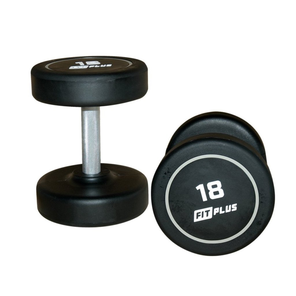 FIT PLUS pevná jednoruční polyuretanová činka, vhodná pro domácí cvičení nebo jakékoliv fitness centrum. Nové logo FIT PLUS nyní ještě více vyniká v šedé barvě kroužek na činky.