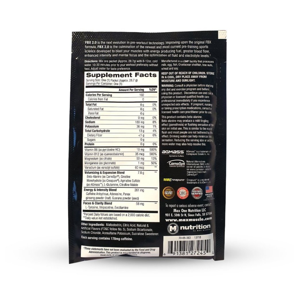 Max Muscle FBX 2.0 je další etapou ve vývoji předtréninkových doplňků stravy. Vylepšené složení FBX 2.0 je vyvrcholením nejnovějších vědeckých výzkumů v oblasti sportovní praxe. Užívání FBX vede ke zvýšení energie, většímu prokrvení svalů, zvýšení intenzity cvičení a zlepšení mentálního soustředění na trénink.