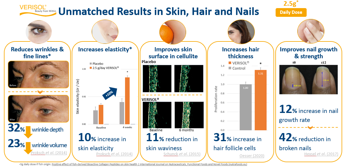 Zákazníci, kteří požijí přírodní produkt Bioactive Collagen Peptides® VERISOL® speciálně optimalizovaný pro kosmetické aplikace, mohou zažít znatelně pevnější a hladší pokožku s menším počtem vrásek. Pozitivní účinek přípravku VERISOL® se projevuje také ve zlepšené povrchové struktuře pokožky, redukci celulitidy a rychlejším růstu nehtů s údajně menším počtem třepení nehtů. Suroviny pro přípravek VERISOL® pocházejí z různých zdrojů, a proto mají různé kvality: VERISOL® P (vepřové maso) surovina), VERISOL® B (surovina z skotu) a VERISOL® F (surovina z ryb).
